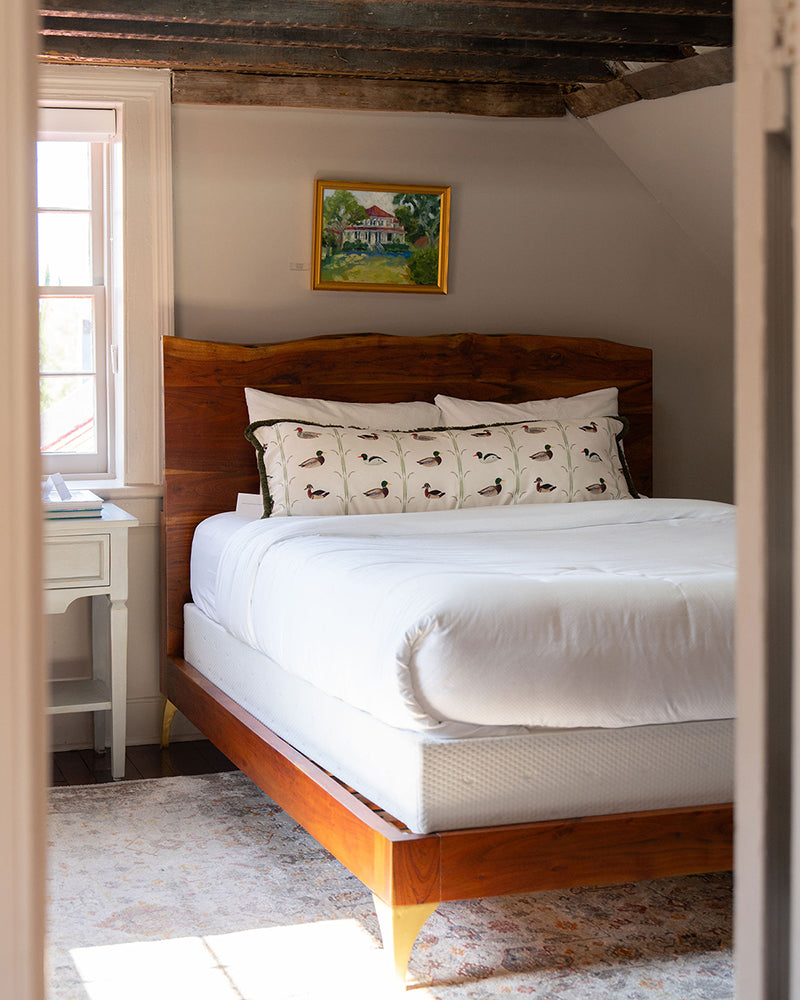 Our bedding line starts with Jordan Connelly’s hand-painted artwork, created in her Charleston studio where rivers, tides, and coastal light inspire every design. Each pattern brings nature’s movement to life, infusing spaces with warmth, color, and timeless elegance.