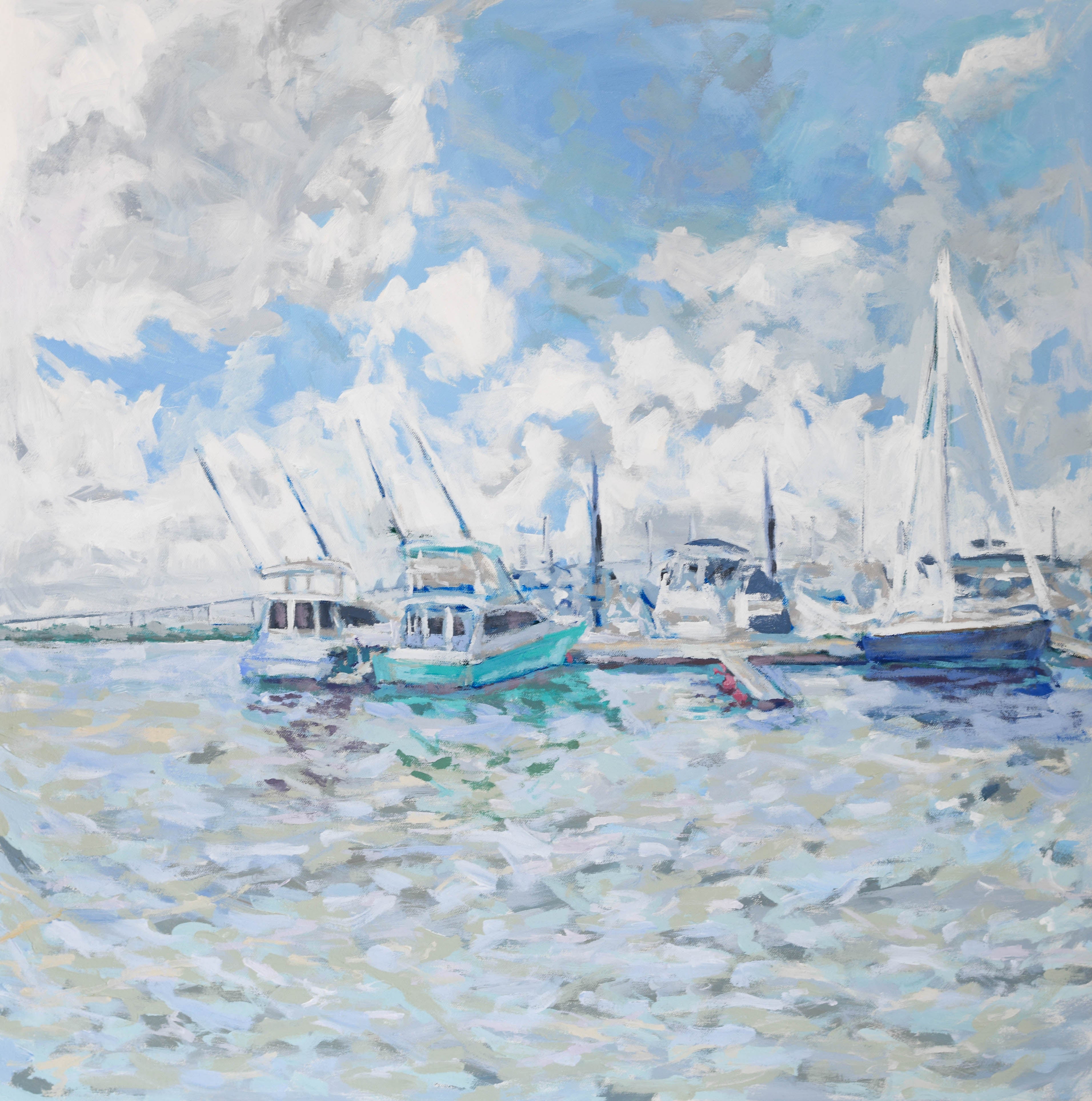 'Docked in Charleston Harbor is painted on canvas with a 1.5" depth painted white so it can be displayed with or without a frame. Framing is available in a thin floater frame with a gold, white, silver, or natural maple finish. The frame adds ~1.5" to each side.