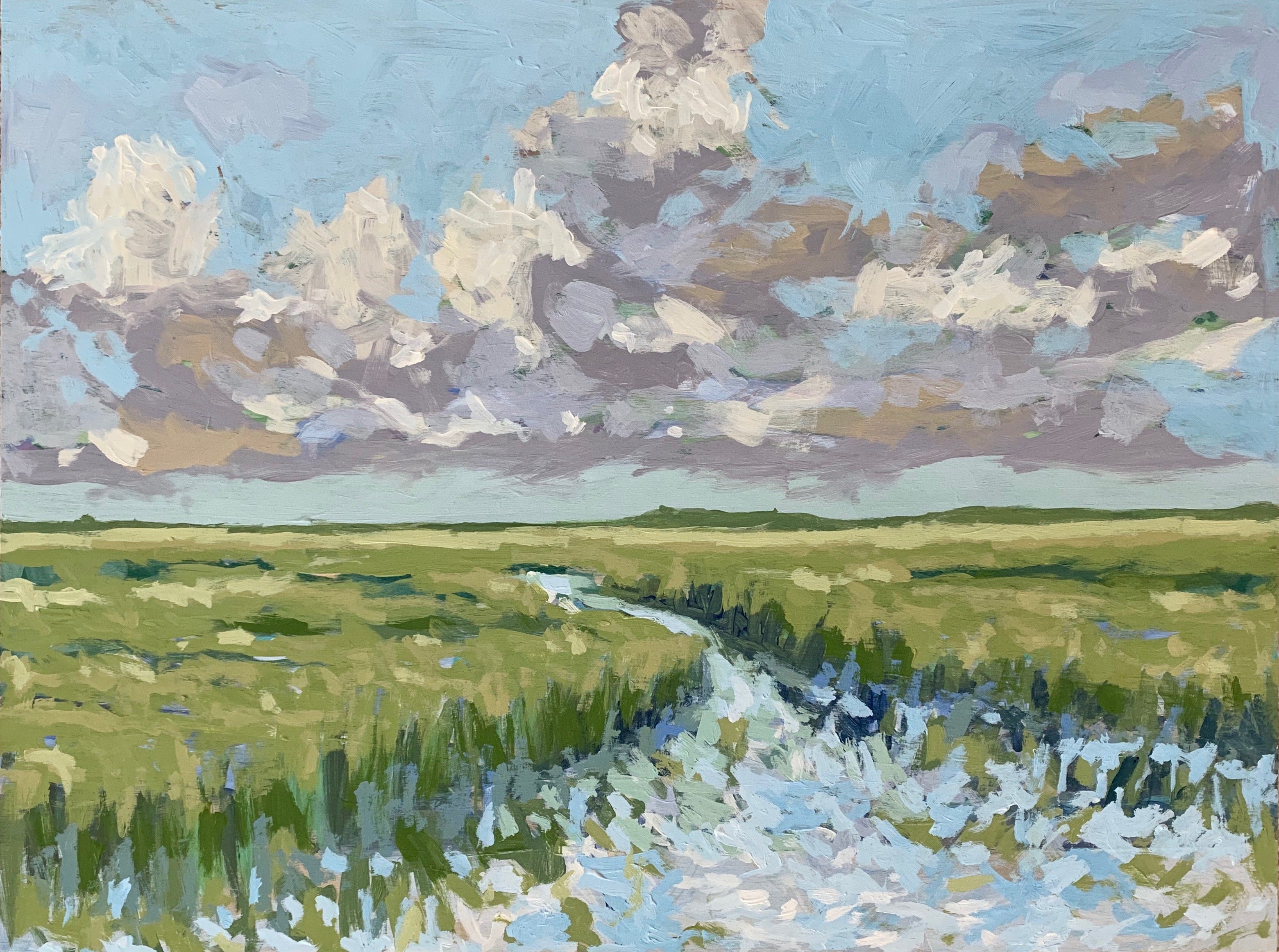 'Marsh Hue' is painted on birch panel with a 5/8" depth painted white so it can be displayed with or without a frame. Framing is available in wide flat wood with a gold leaf with or without a thin linen mat, white, or silver finish, or in a thin floater frame with a gold, white, silver, or natural maple finish. The wide frame adds ~3.5" to each side, and the float adds ~1.5" to each side.