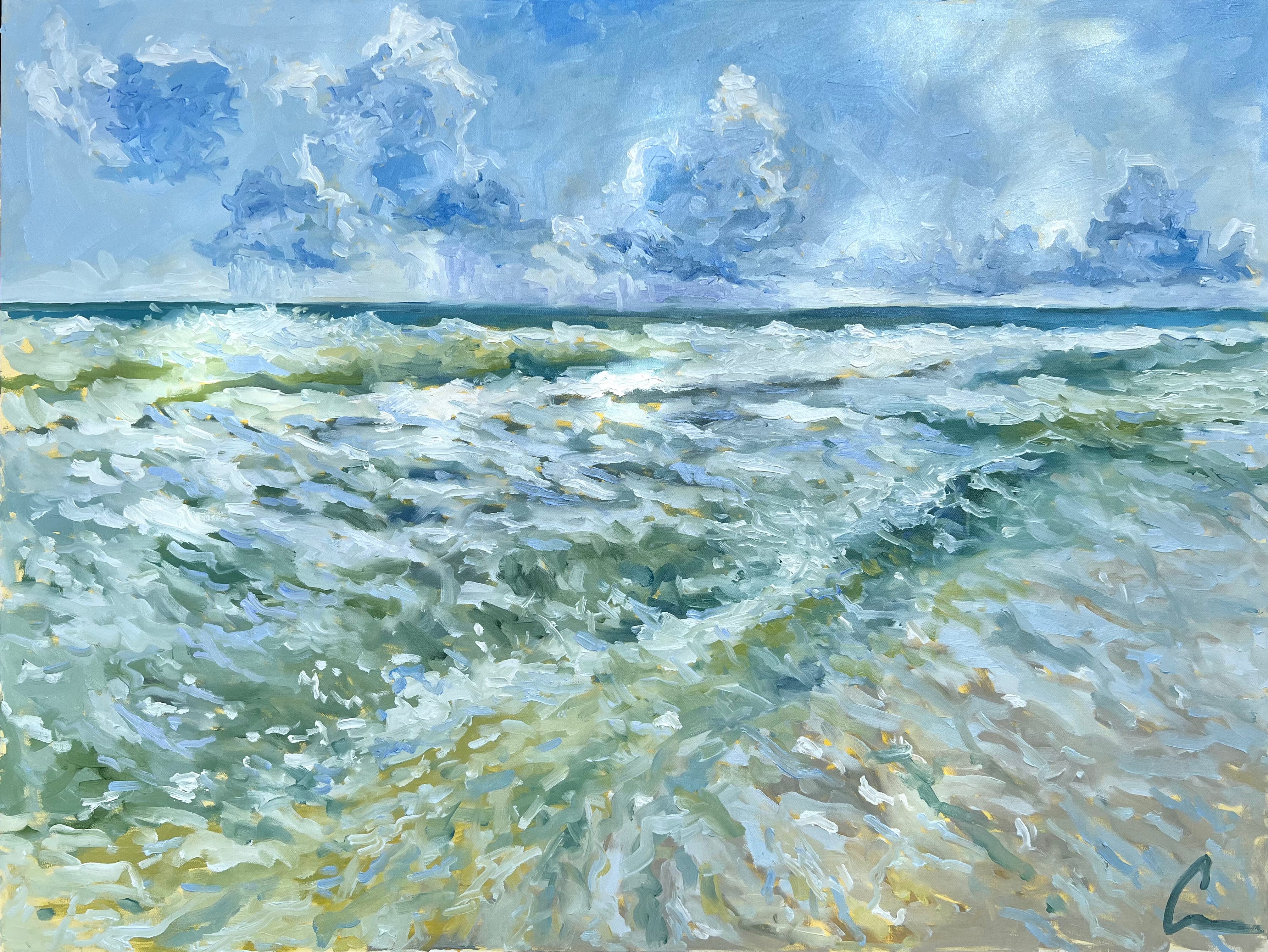 This piece is oil on canvas inspired by the Carolina sky. It is part of the Wild and Free series. The Wild and Free series was born out of a desire to chase happiness, to take a leap of faith and fuel my passion, to take my love for nature and the water and splash that all over the canvas so wild and free that the viewer feels the same soul-filled passion. I hope this piece brings your heart to that place.