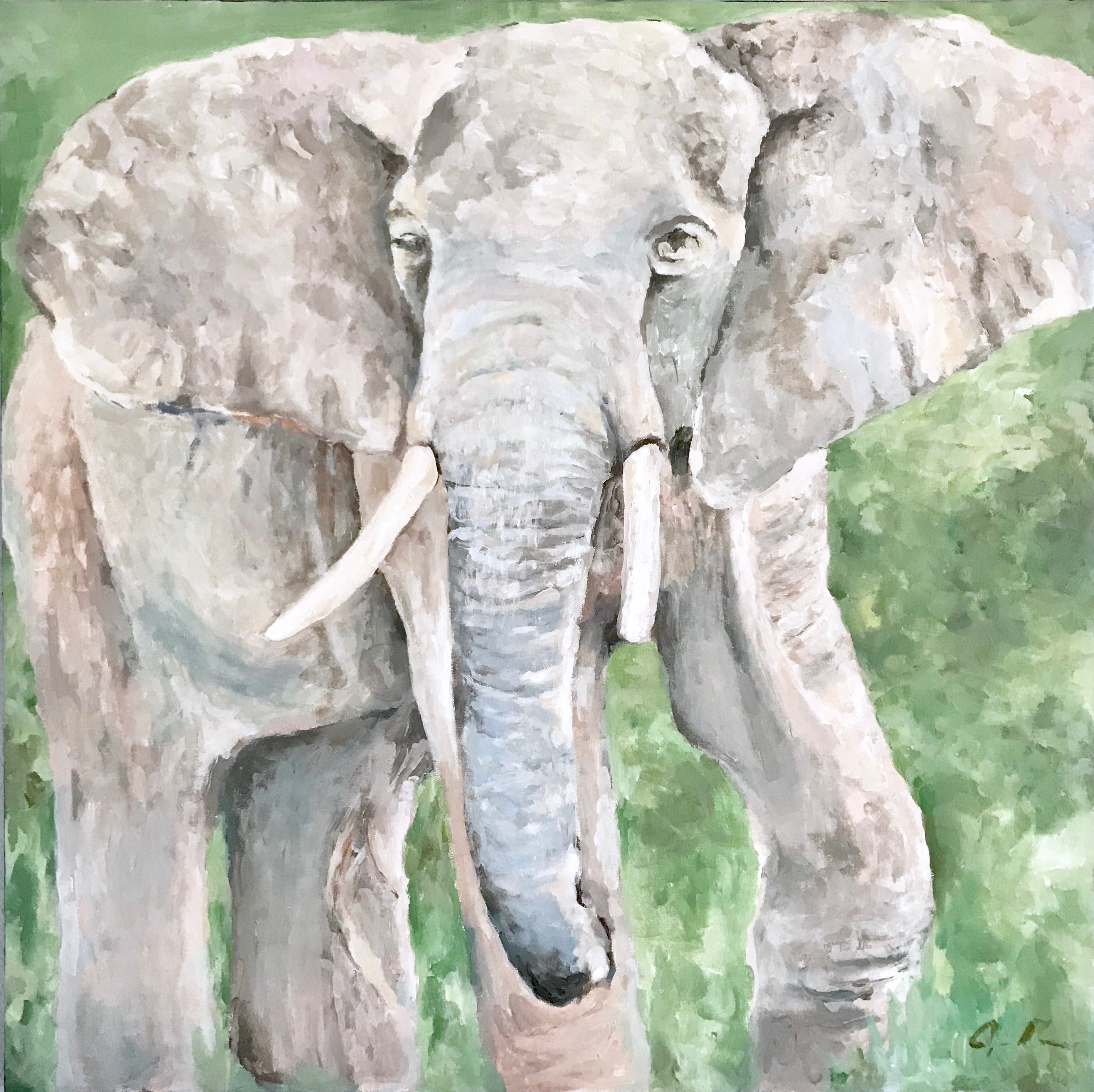 'Elephant for Health' is painted on birch panel with a 5/8" depth painted black so it can be displayed with or without a frame. Framing is available in wide flat wood with a gold leaf with or without a thin linen mat, white, or silver finish, or in a thin floater frame with a gold, white, silver, or natural maple finish. The wide frame adds ~3.5" to each side, and the float adds ~1.5" to each side. 10% of the purchase of this piece will be donated to One World Health.