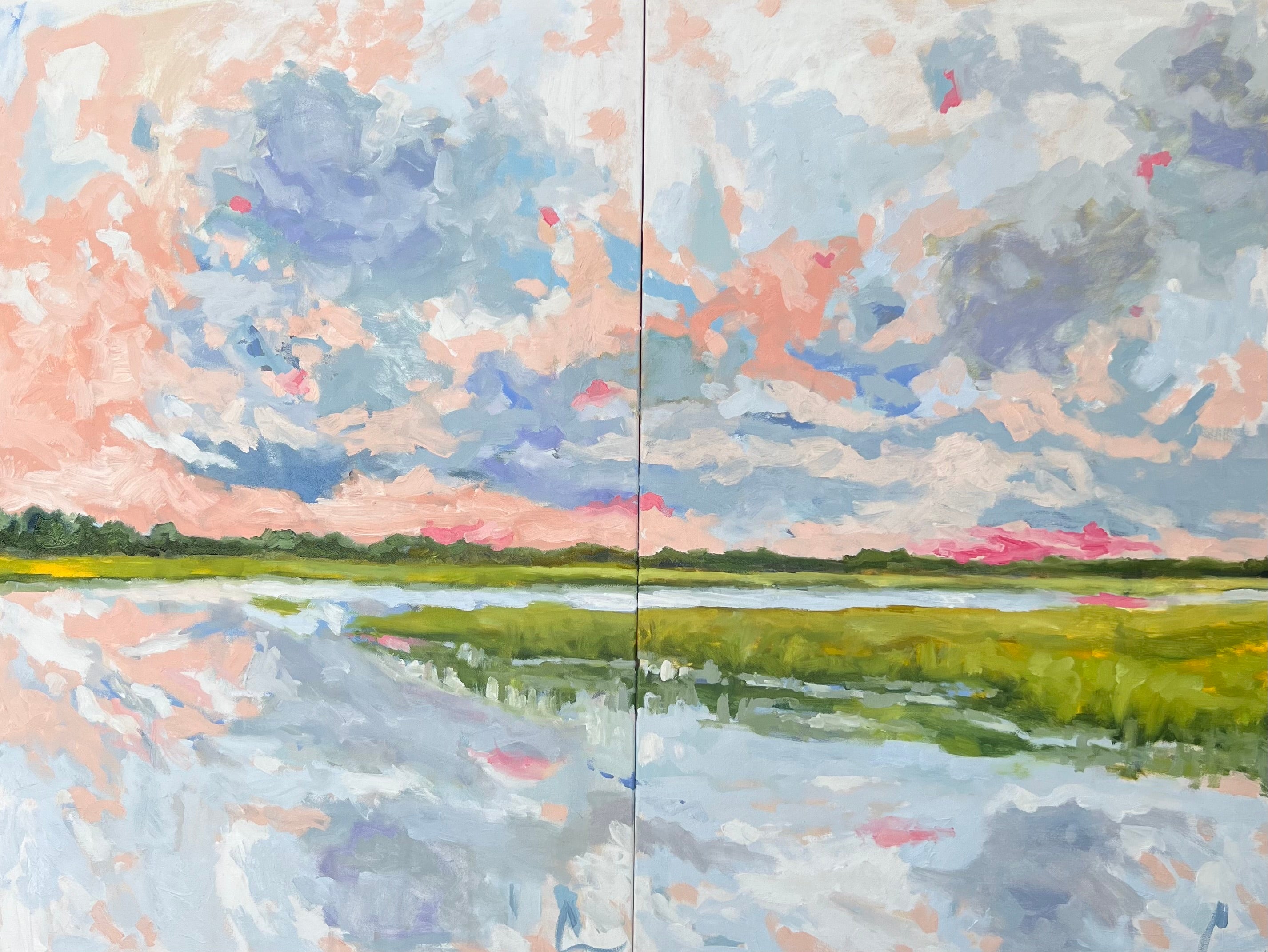 This is a diptych oil on canvas that comes unframed. It comes with two 24x36 panels that can be hung together or apart. There is an option to add framing if desired. Please email me within 24 hours of order if you'd like to add framing. Orders will ship within 7-14 business days as is, framing adds additional time.