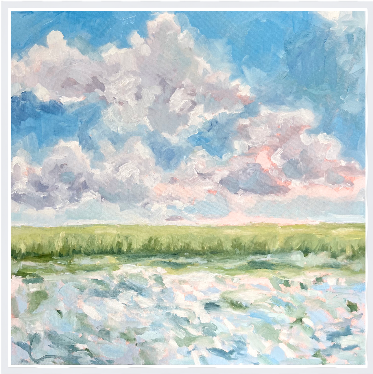 This is a 24x24 oil paint on canvas that comes framed in a white float frame. Exterior measurements are ~26x26 with the frame. It has been varnished to protect from dust and light. Orders will ship within 7-14 business days.