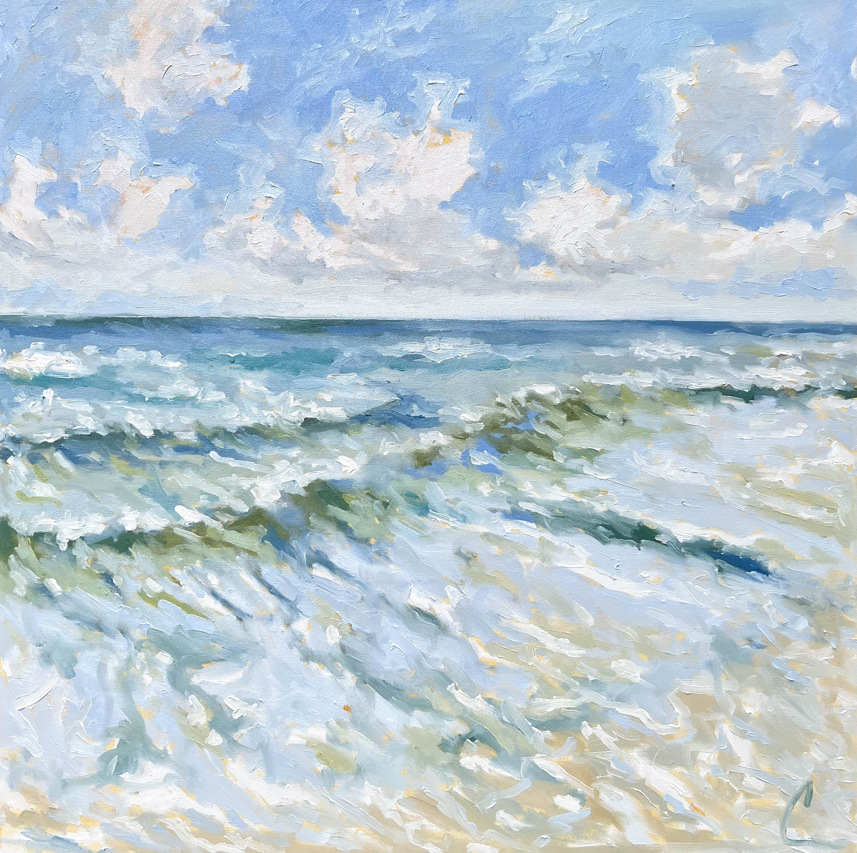 This piece is oil on canvas inspired by the Carolina ocean. It is part of the Wild and Free series. The Wild and Free series was born out of a desire to chase happiness, to take a leap of faith and fuel my passion, to take my love for nature and the water and splash that all over the canvas so wild and free that the viewer feels the same soul-filled passion. I hope this piece brings your heart to that place.