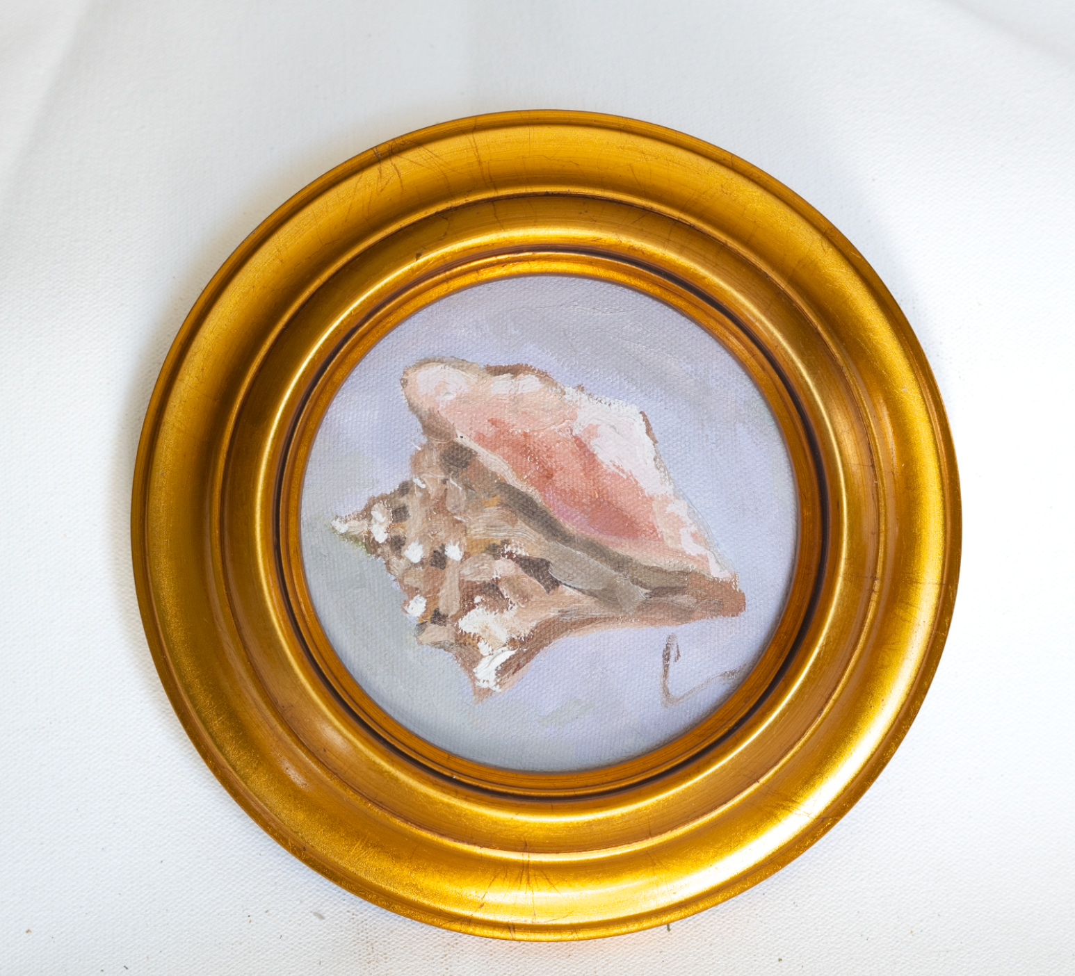 This is a 5x5" oil on canvas. Framing is included and adds around 1-1.5" to each side.