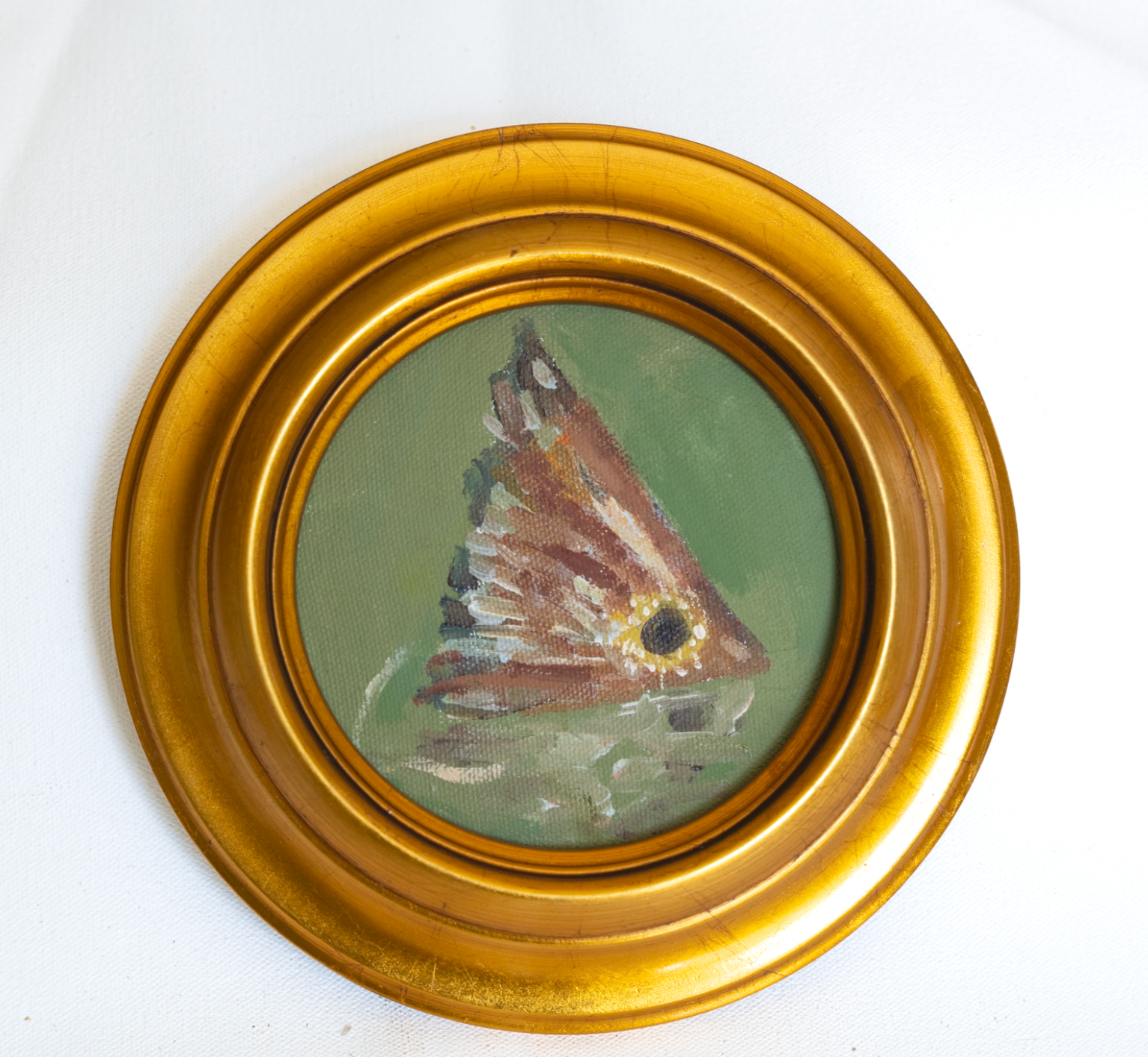 This is a 5x5" oil on canvas. Framing is included and adds around 1-1.5" to each side.