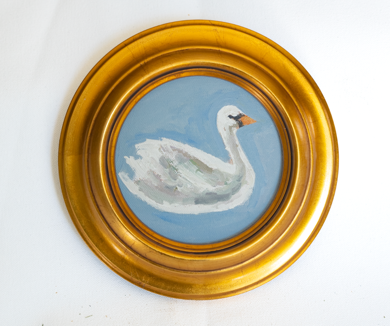 This is a 5x5" oil on canvas. Framing is included and adds around 1-1.5" to each side.