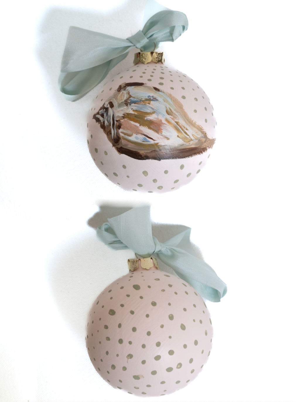 This is a 3x3" acrylic on ceramic ornament that comes varnished in gloss and adorned with a silk ribbon. Ornaments come in individual boxes for safe keeping.