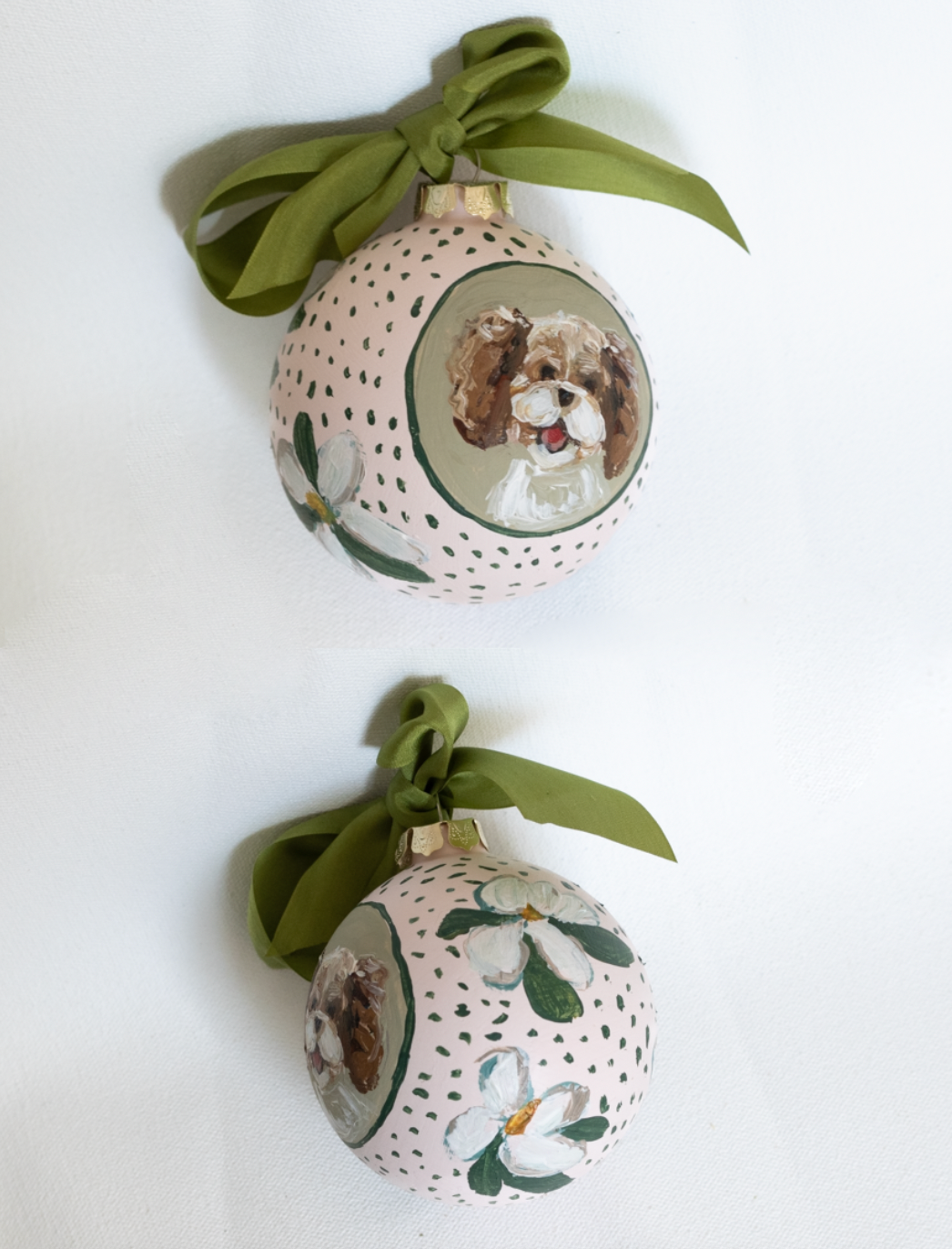 This is a 3x3" acrylic on ceramic ornament that comes varnished in gloss and adorned with a silk ribbon. Ornaments come in individual boxes for safe keeping.