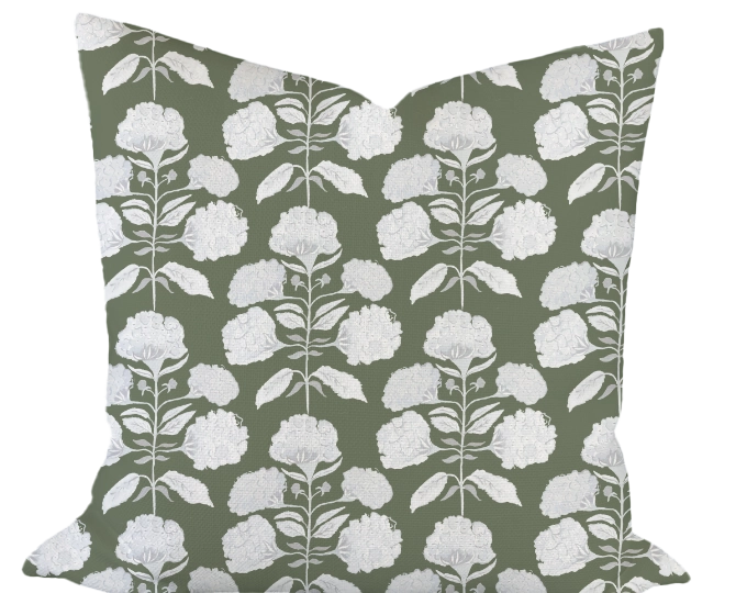 Hydrangea Bloom in Salt on Olive Custom Pillow