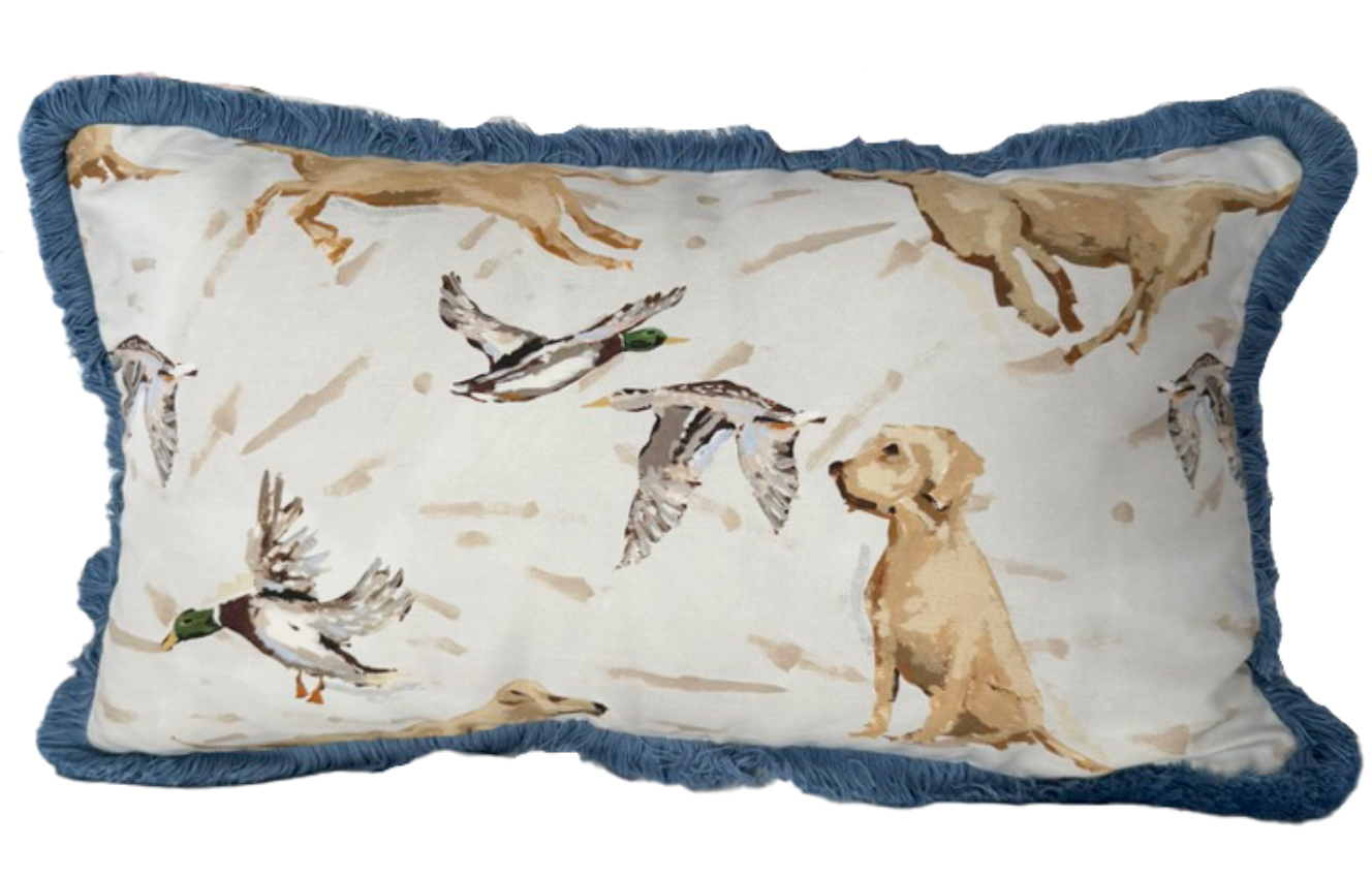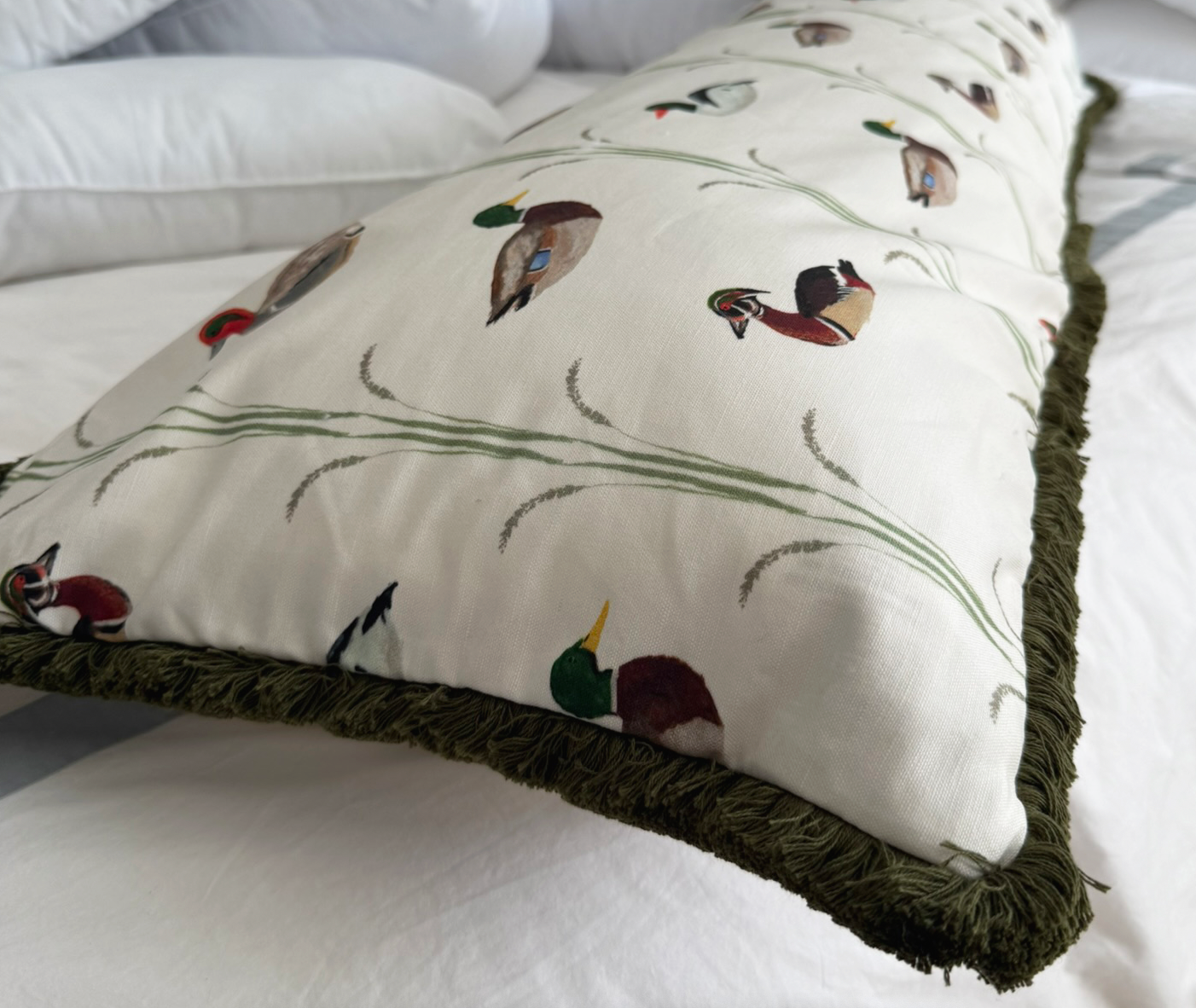 Large Lumbar Ducks Pillow Cover- Green Fringe