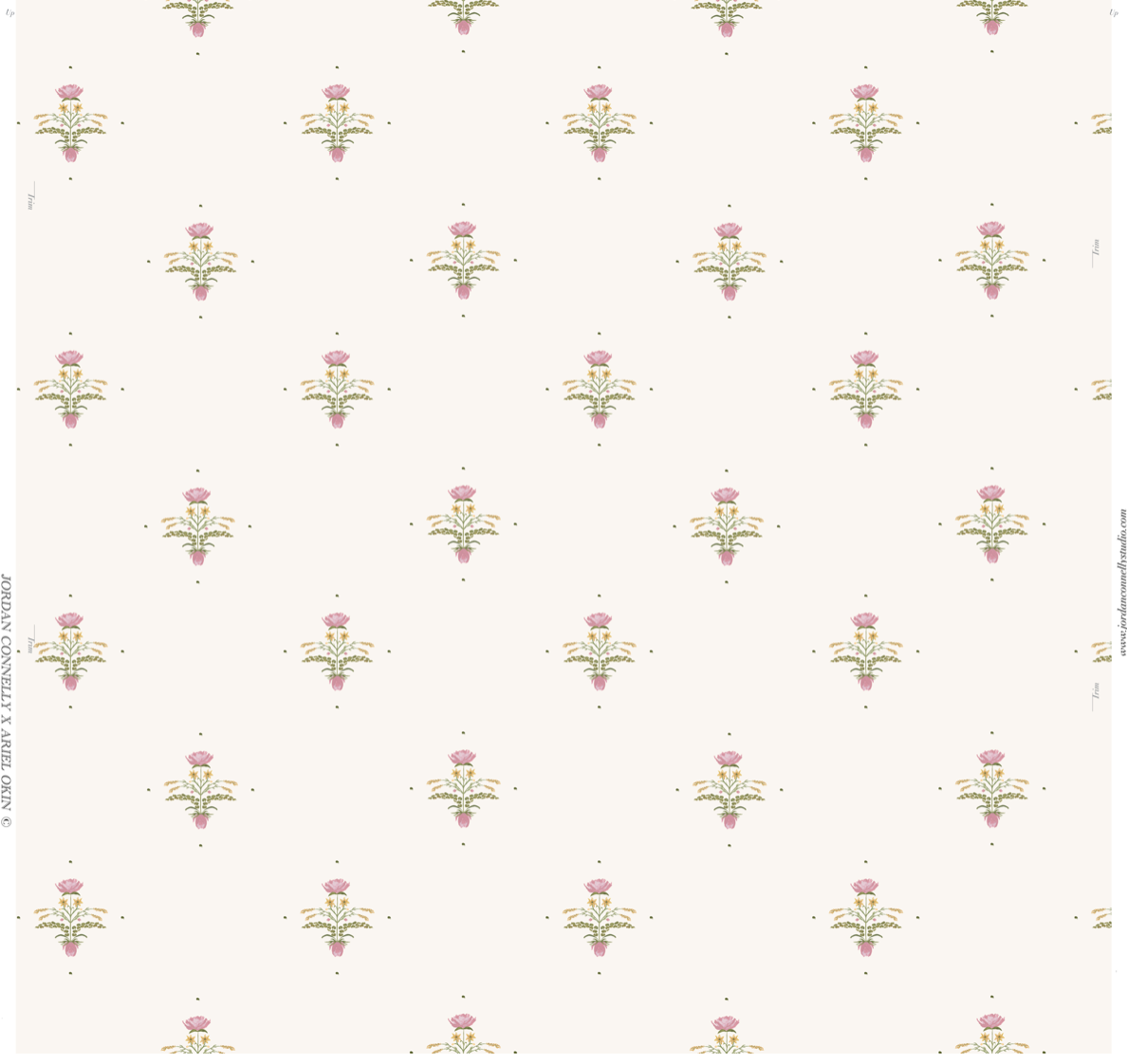 This hand-painted wallpaper design by Jordan Connelly is digitally printed in the USA using eco-friendly inks on flat matte paper. Each pattern captures painterly detail and thoughtful storytelling inspired by nature and place.