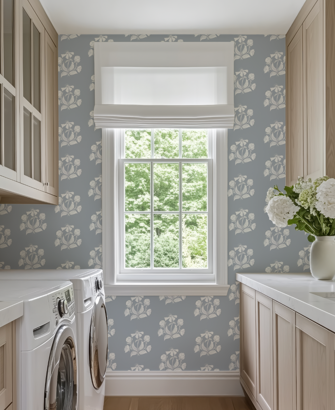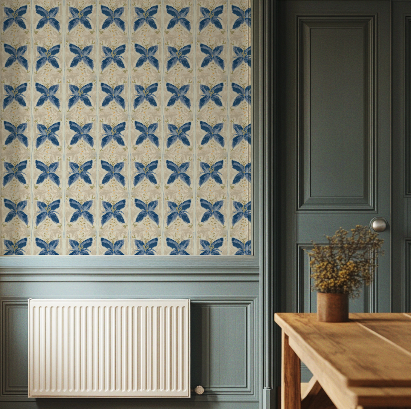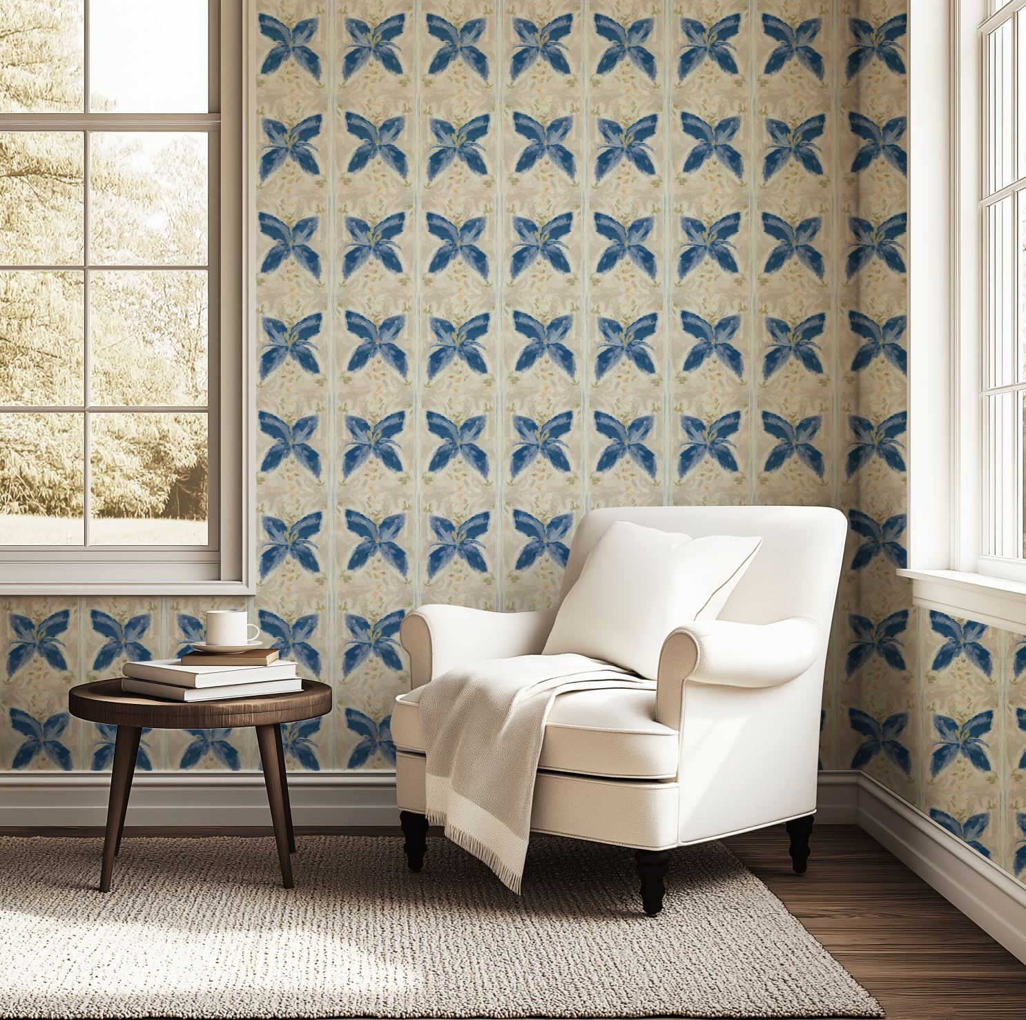 Blocked Tulips in Blue Grasscloth Wallpaper