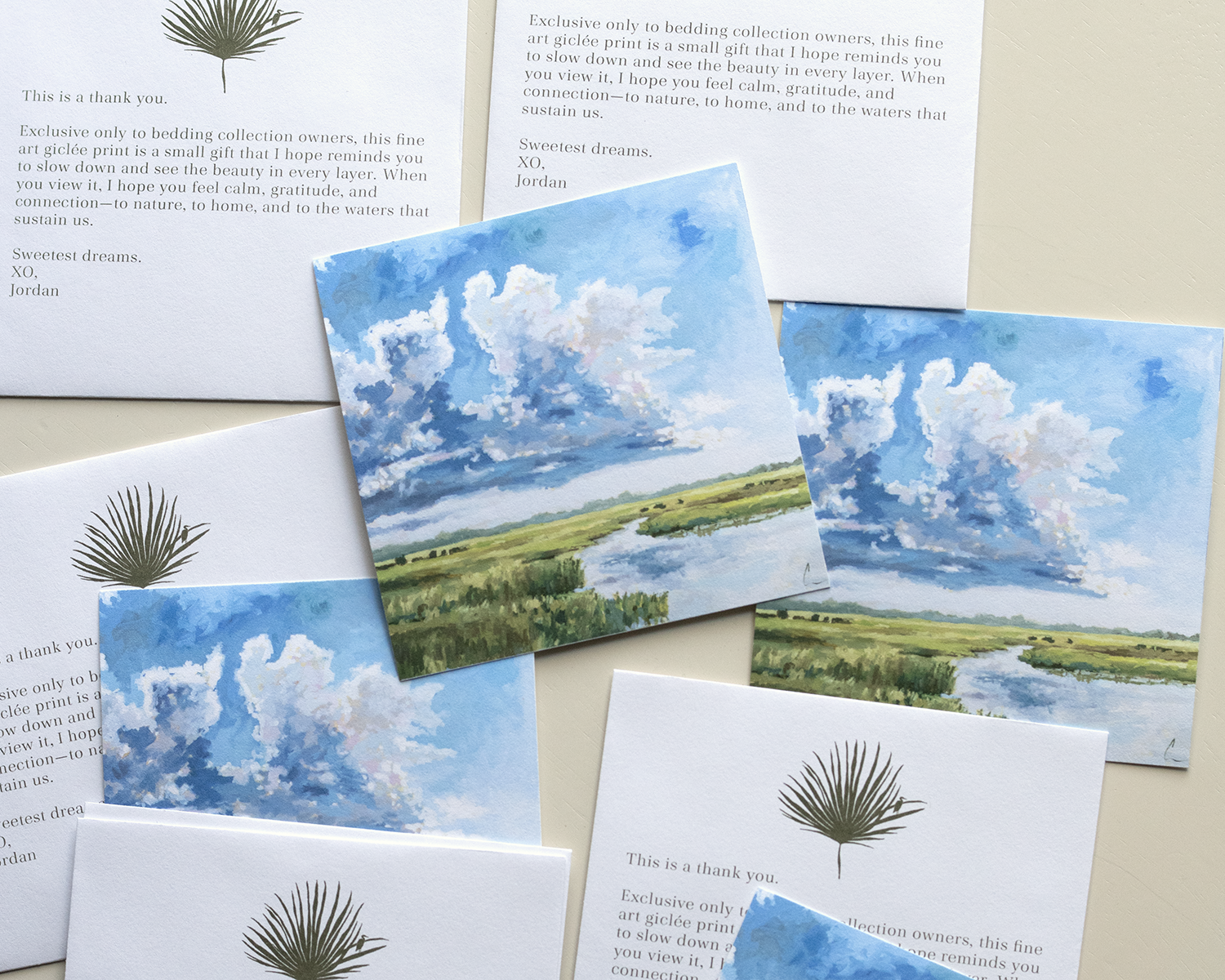 Exclusive to the bedding collection, each order includes a 4x4 fine art giclée print by Jordan Connelly as a thank-you meant to evoke calm, gratitude, and connection to nature and home.
