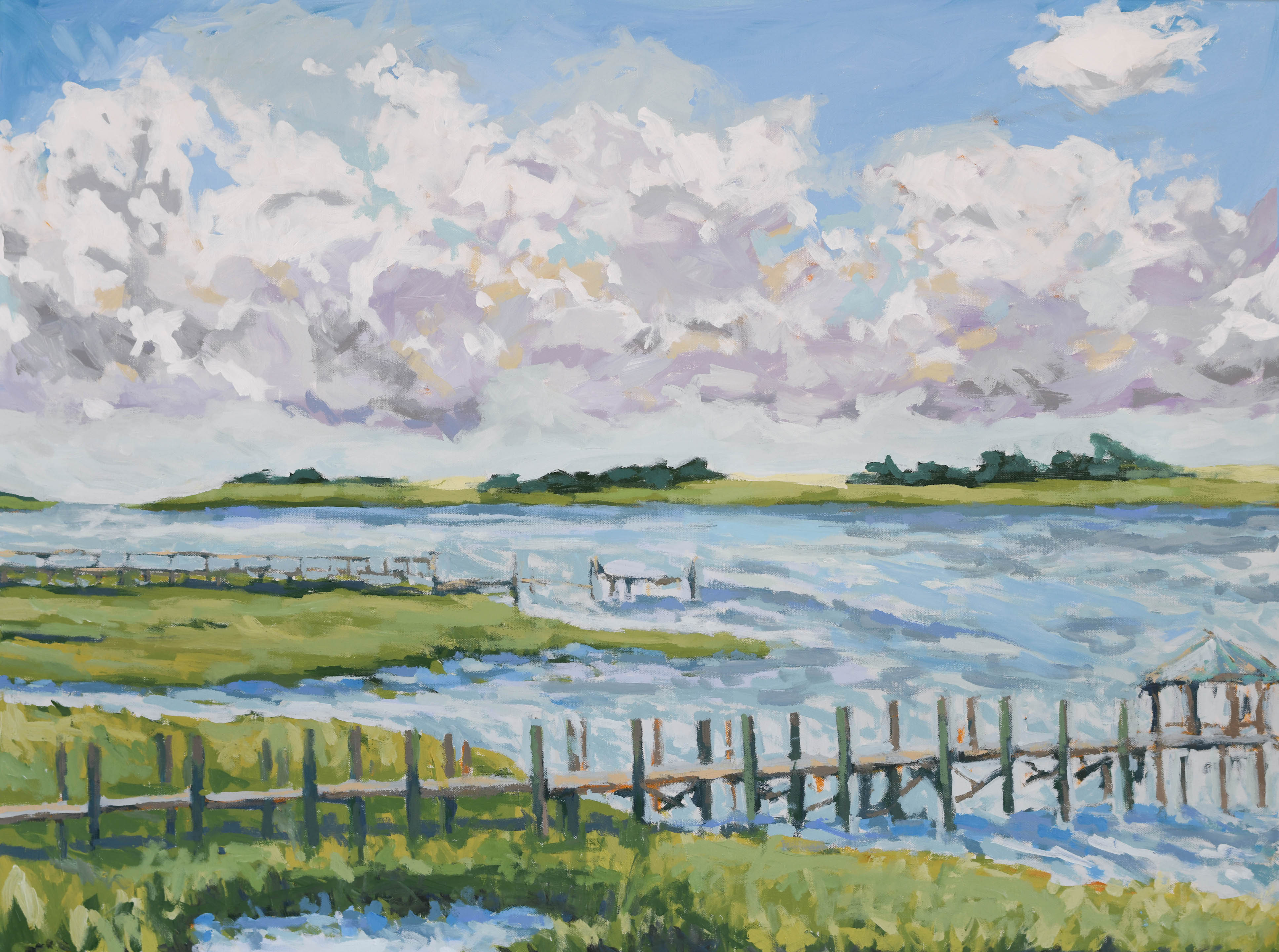 'The View from Sailfish' is painted on canvas with a 1.5" depth painted white so it can be displayed with or without a frame. Framing is available in a thin floater frame with a gold, white, silver, or natural maple finish. The float adds ~1.5" to each side.
